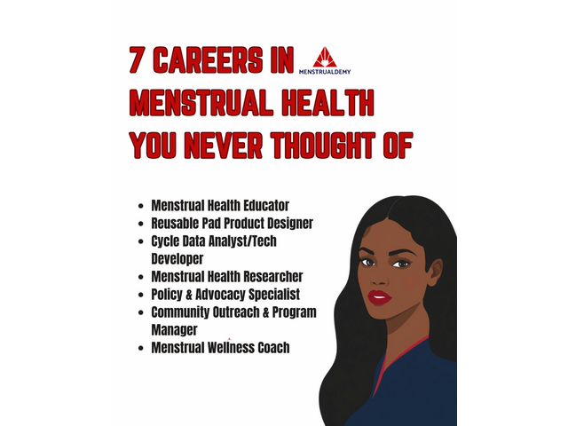 1. Menstrual Health Educator: Teaching girls, women, men and communities how to understand and manage menstruation with dignity. 2. …